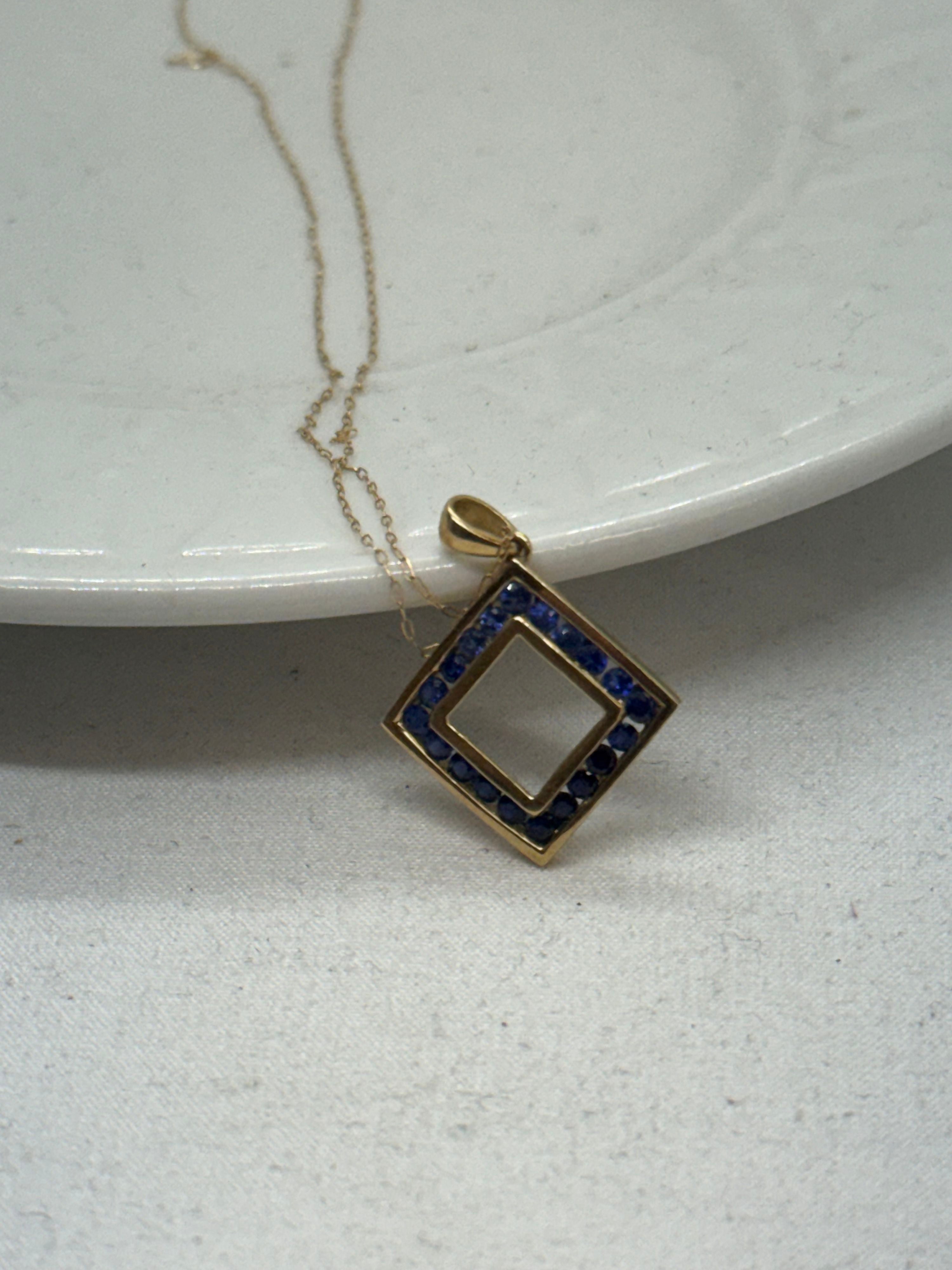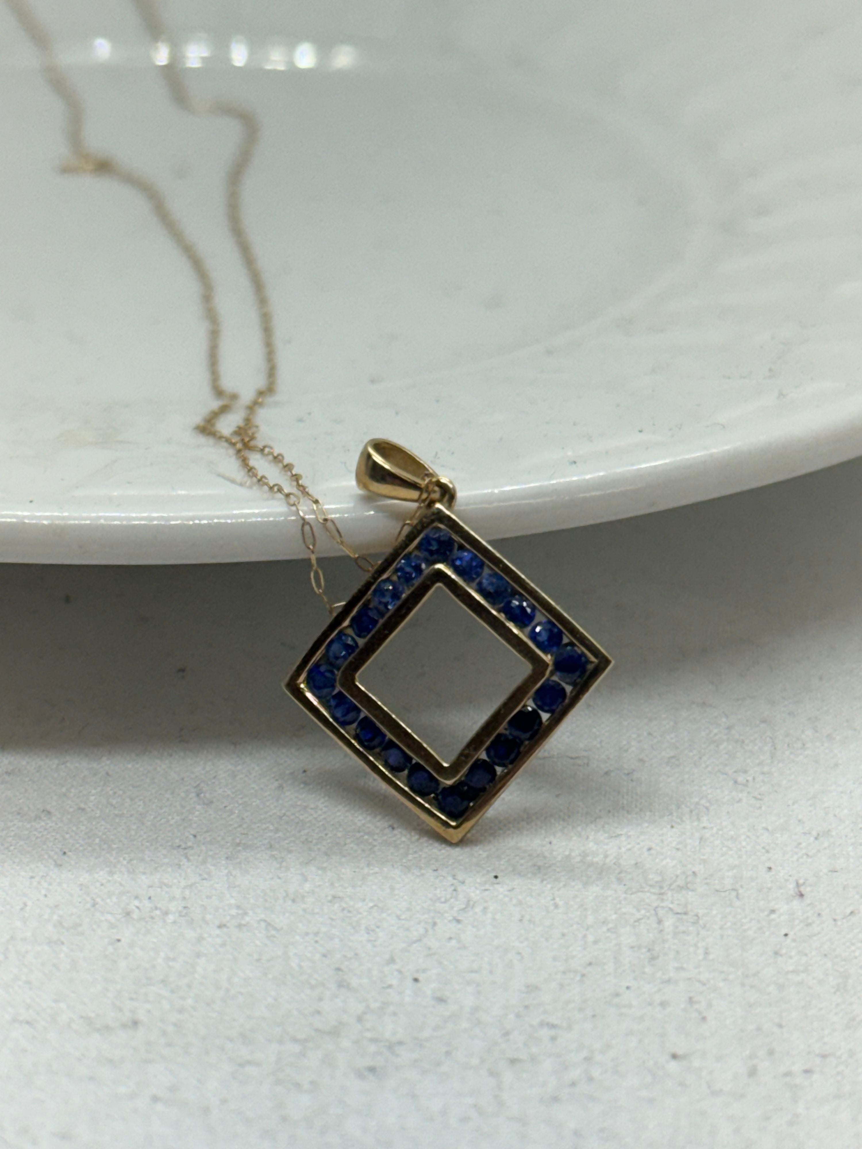10K Yellow Gold Topaz Necklace 2.3g Diamond Shaped Pendant with Blue Topaz Dainty Cable Chain Vintage 24 in.