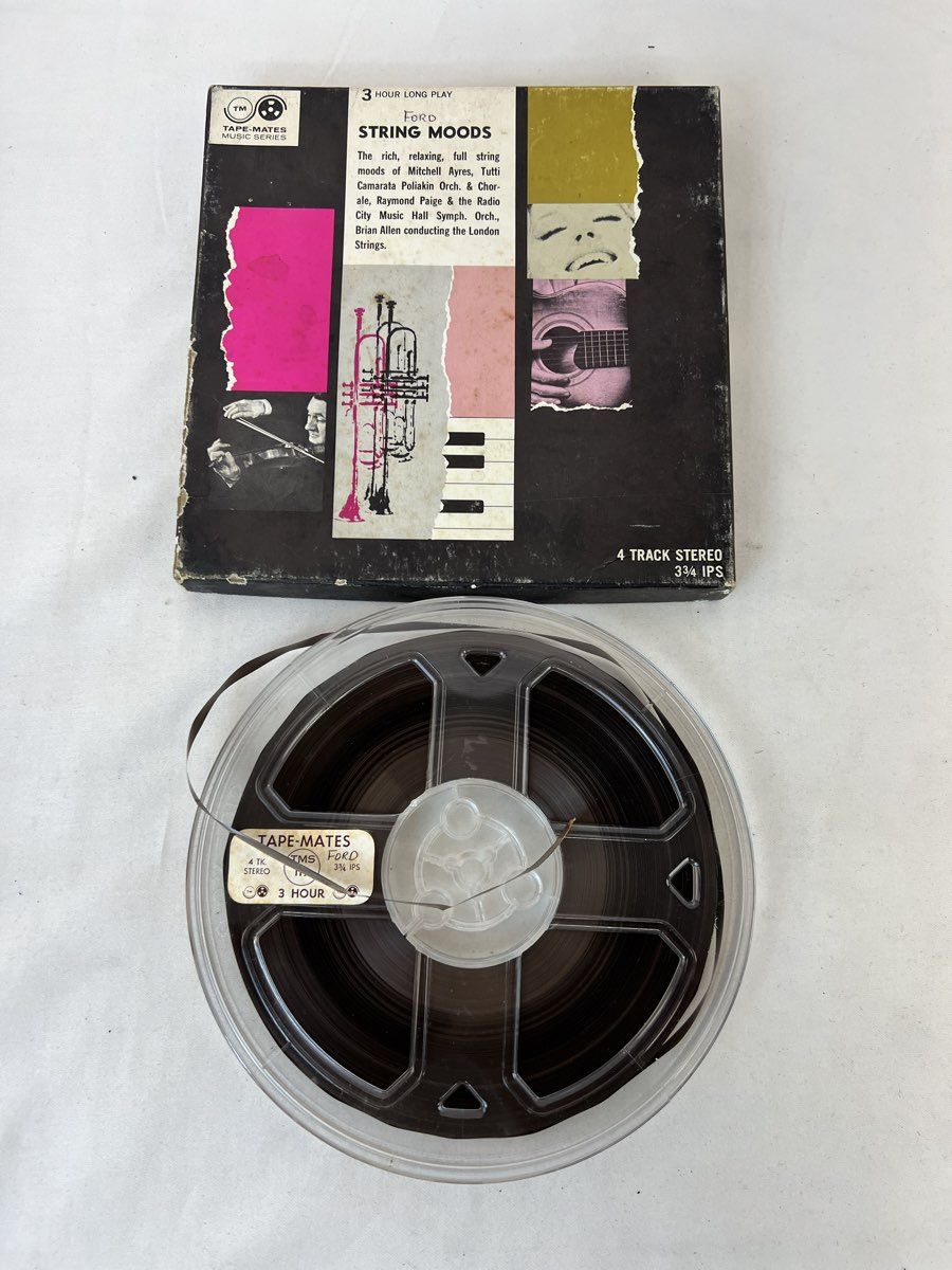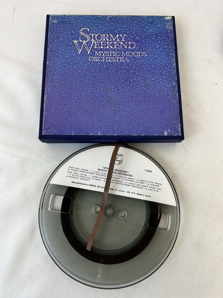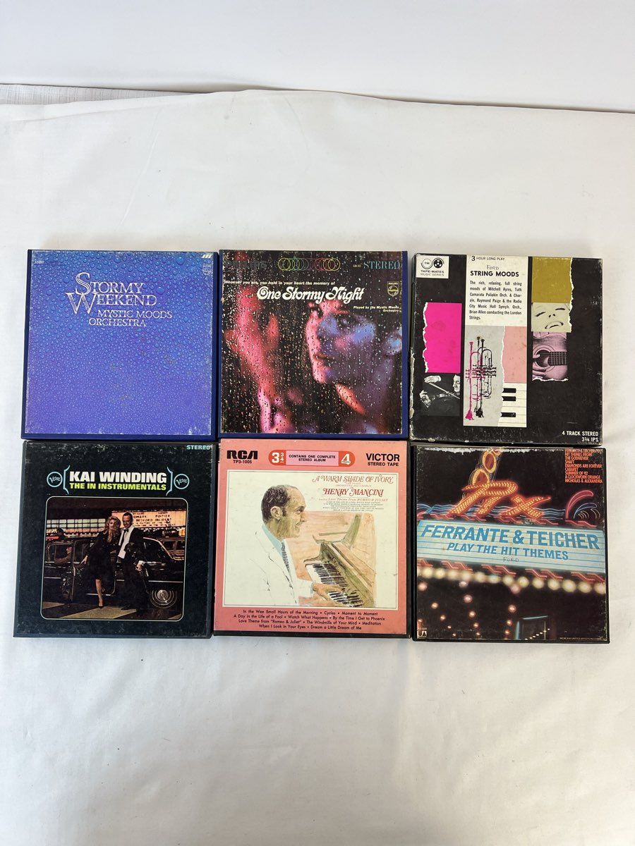Reel To Reel Tapes Contains the Following: Mystic Moods Orchestra Stormy Weekend, Mystic Moods Orchestra One Stormy Night , Tape Mates Ford String Moods, Kai Winding The In Instrumentals, Henry Mancini A Warm Shade of Ivory & Ferrante & Teicher Play the Hit Themes