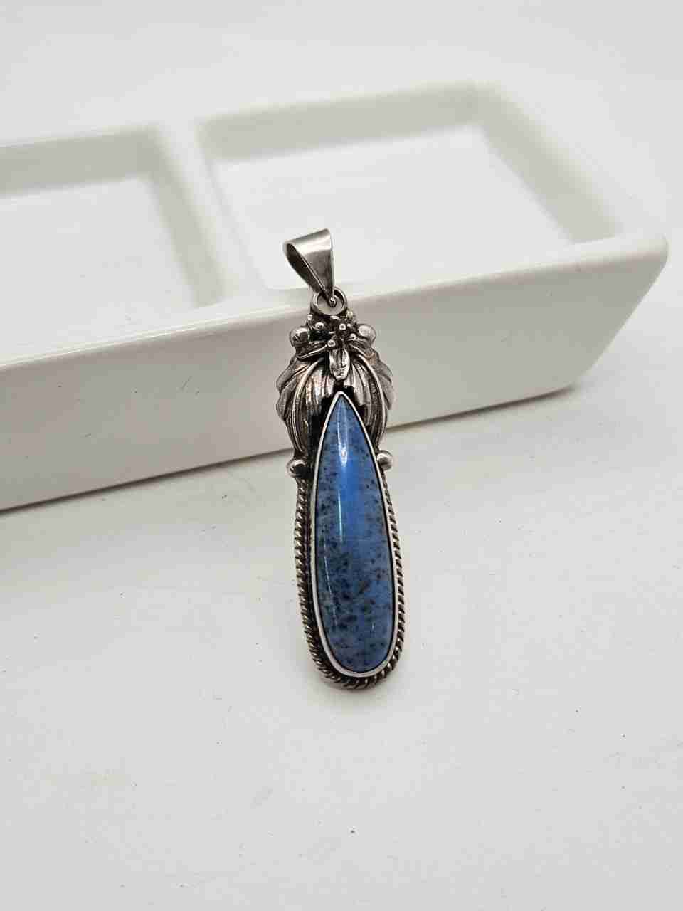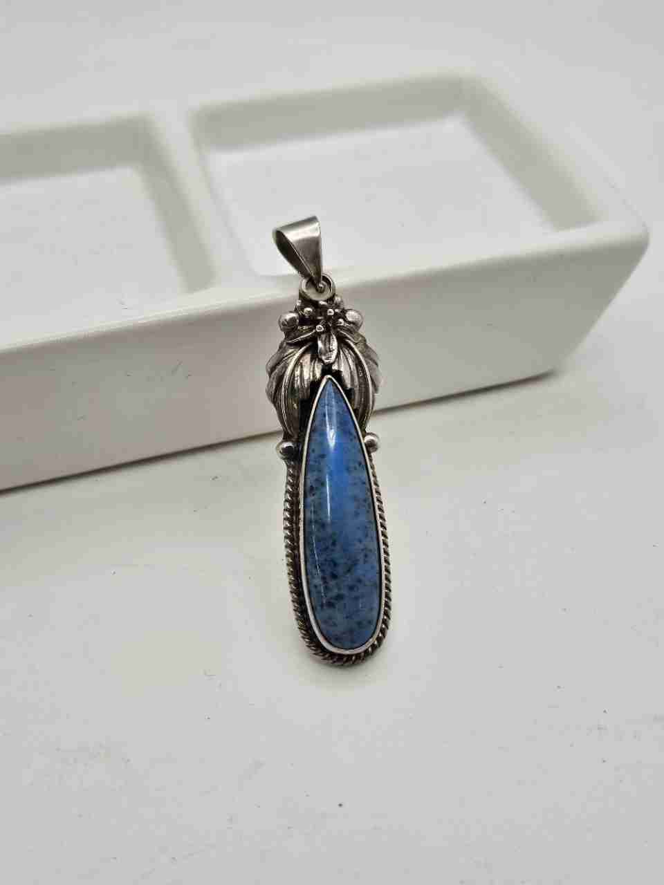 Gorgeous Native American lapis lazuli pendant by Roie Jaque, signed on the back. Has a tear-drop stone with a flower and leaves framing the upper portion.