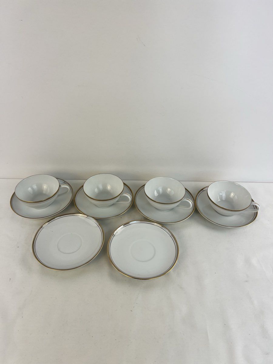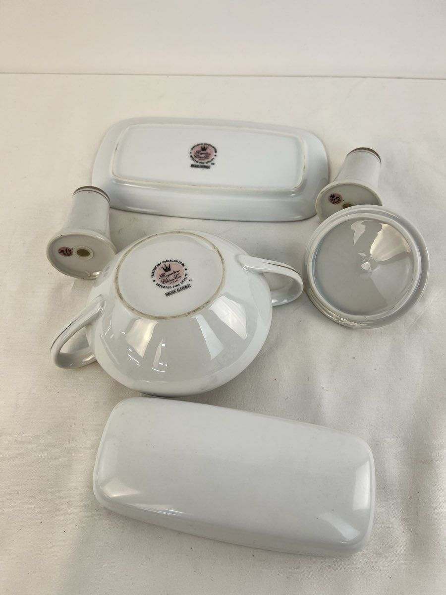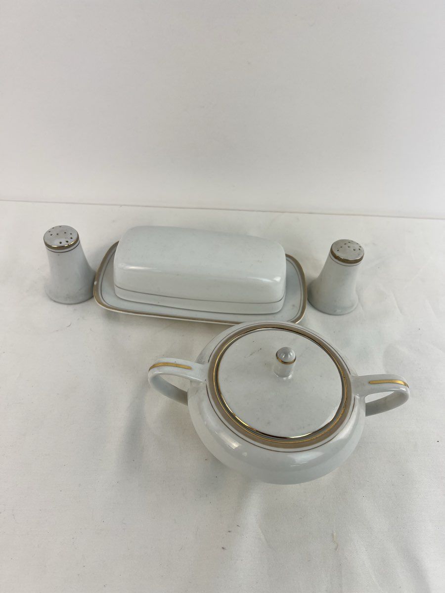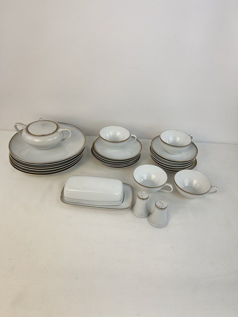 Royalton White, Gold Porcelain Golden Elegance China Set 27-Piece Set Contains the Following: 4x Teacups, 6x Saucers, 6x Bread & Butter Plates, 6x Luncheon Plates, 1x Covered Butter Dish, 1x Salt & Pepper, 1x Lidded Sugar Bowl