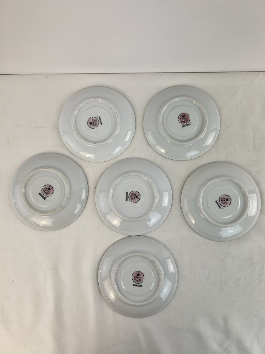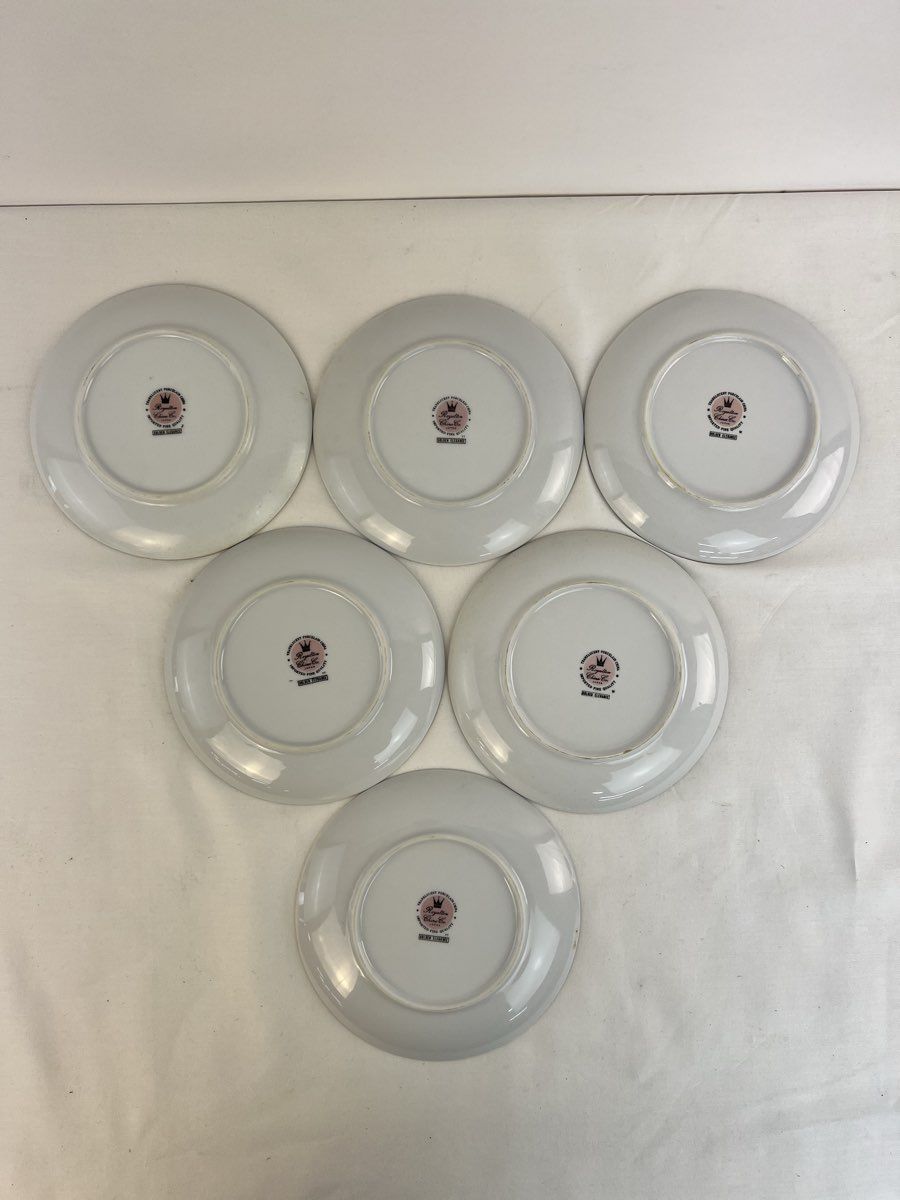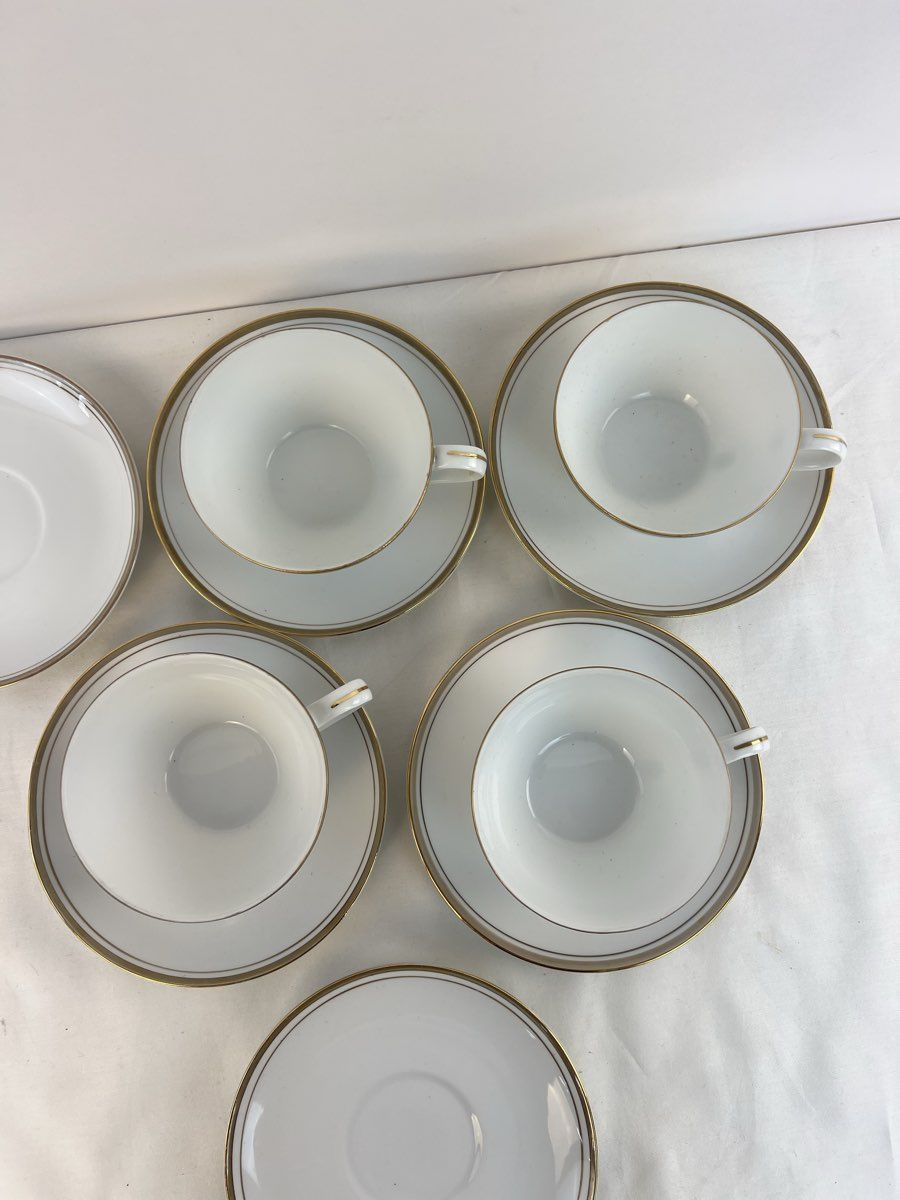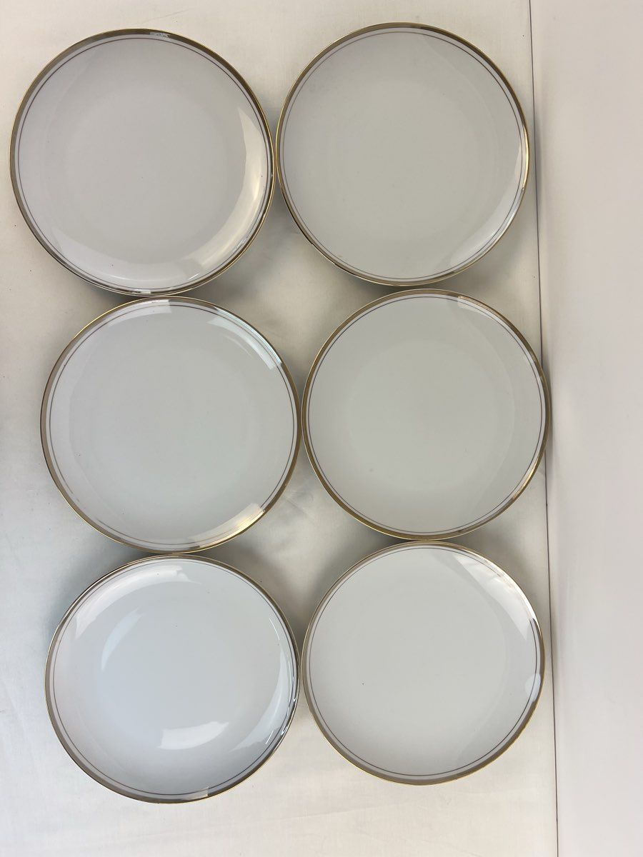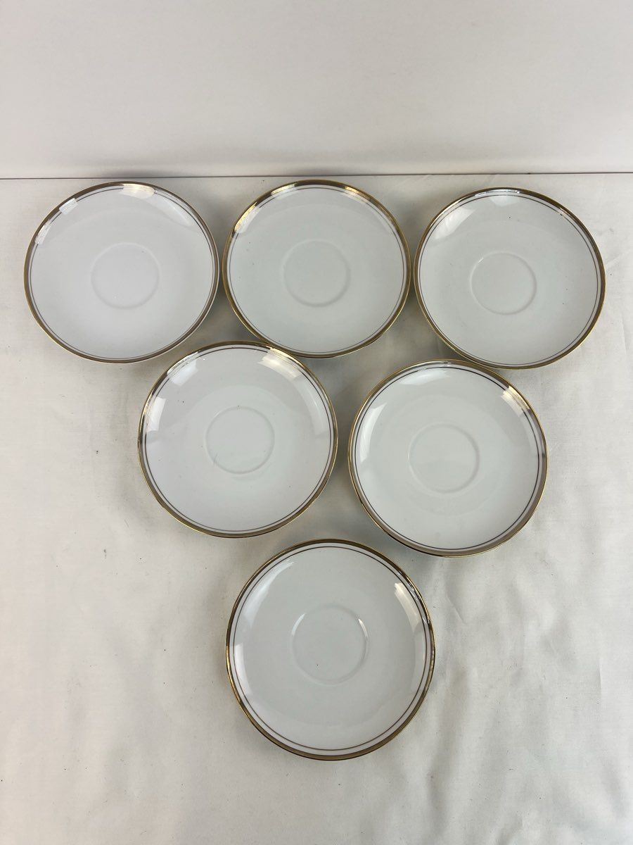 Royalton White, Gold Porcelain Golden Elegance China Set 27-Piece Set Contains the Following: 4x Teacups, 6x Saucers, 6x Bread & Butter Plates, 6x Luncheon Plates, 1x Covered Butter Dish, 1x Salt & Pepper, 1x Lidded Sugar Bowl